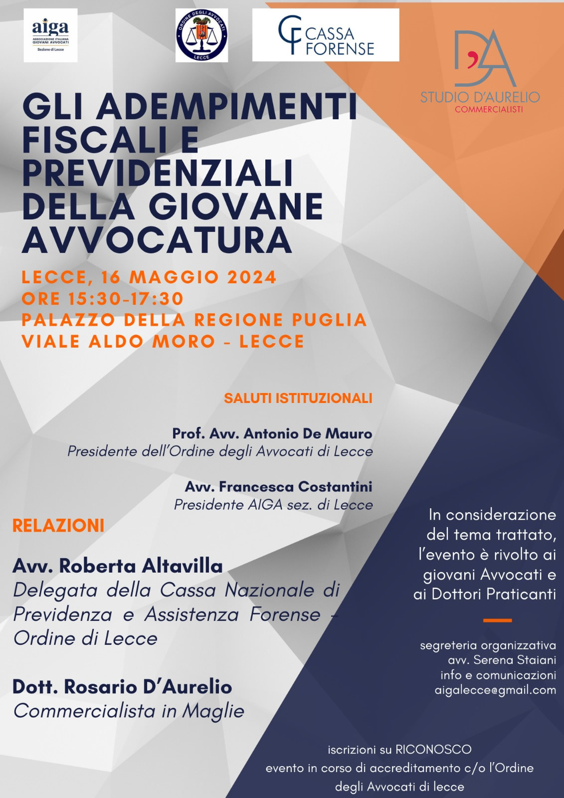 È con grande piacere che segnaliamo la partecipazione del dott. Rosario D’Aurelio quale relatore dell’evento organizzato dall’aiga e dalla Cassa Forense che si terrà a Lecce, presso il Palazzo della Regione Puglia in Viale Aldo Moro, giovedì 16 maggio 2024 dalle 15:30 alle 17:30.