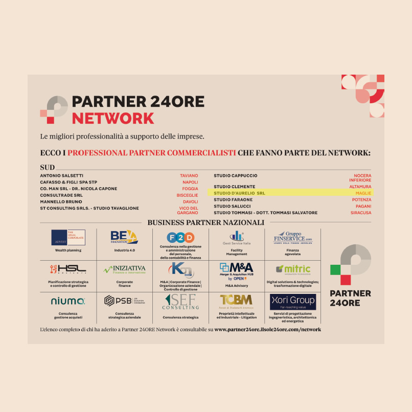Siamo estremamente felici di segnalarvi che nel numero di FARE NETWORK – Professionisti e imprese pubblicato il 23/09/2024, a pagina 11, il Sole 24 Ore ci segnala tra i Professional Partners facenti parte del network professionale “Partner 24 Ore”.